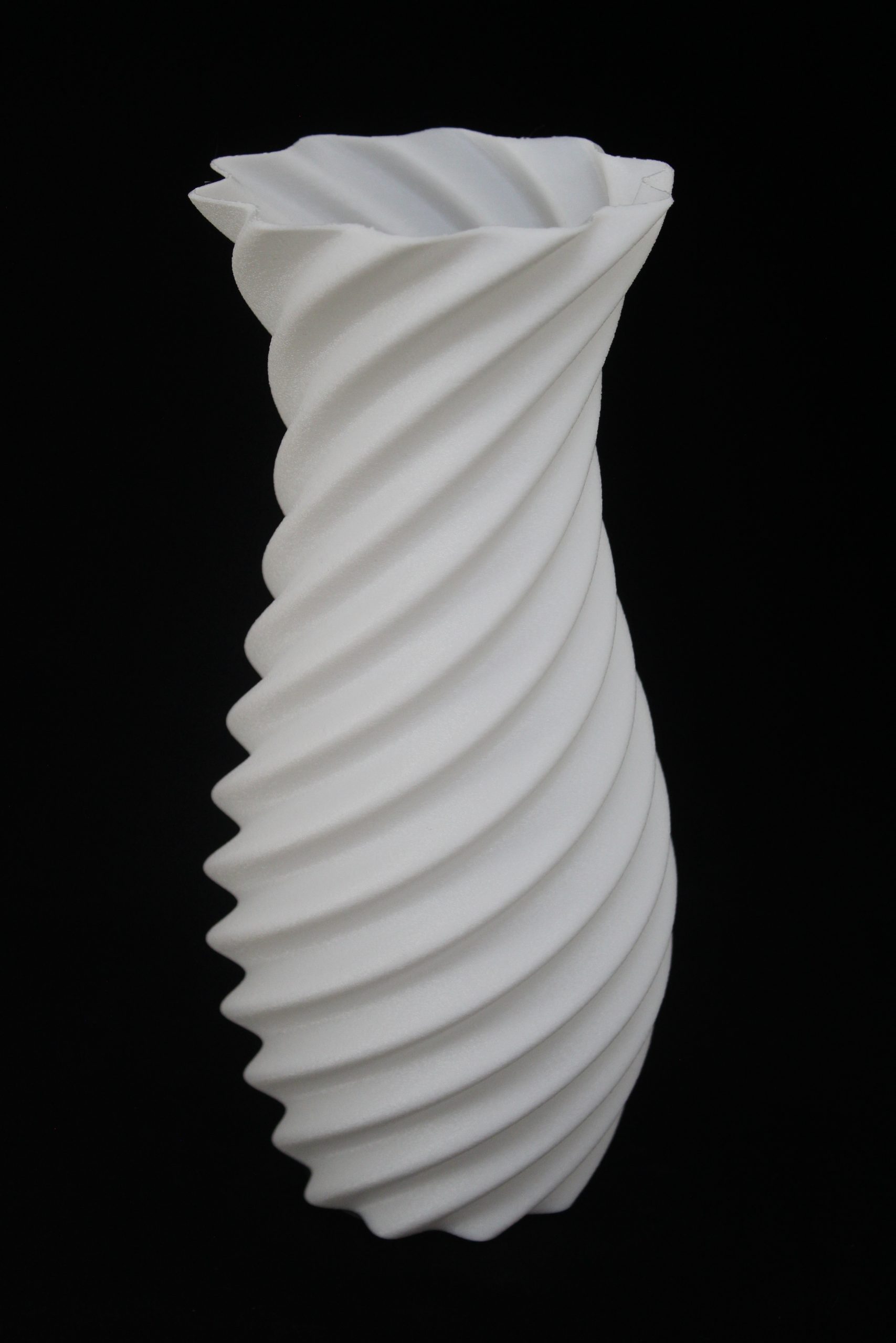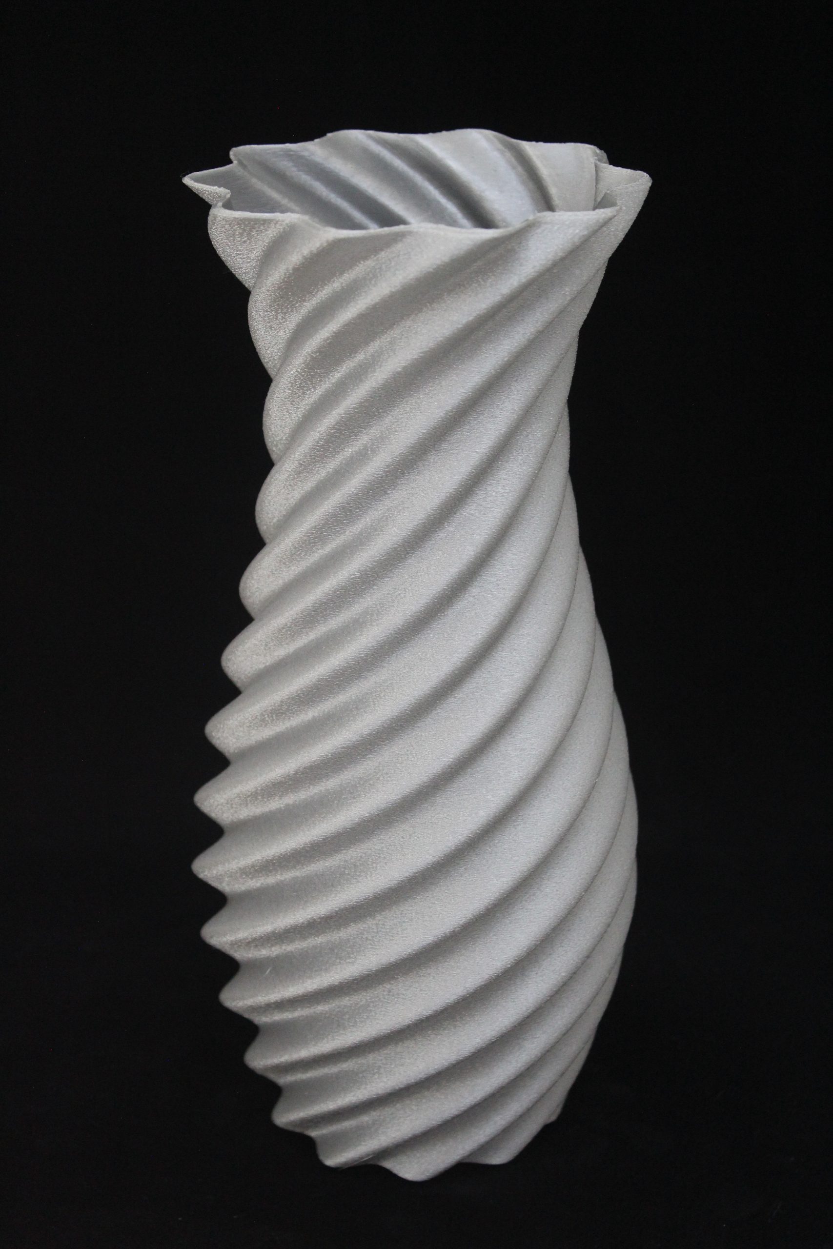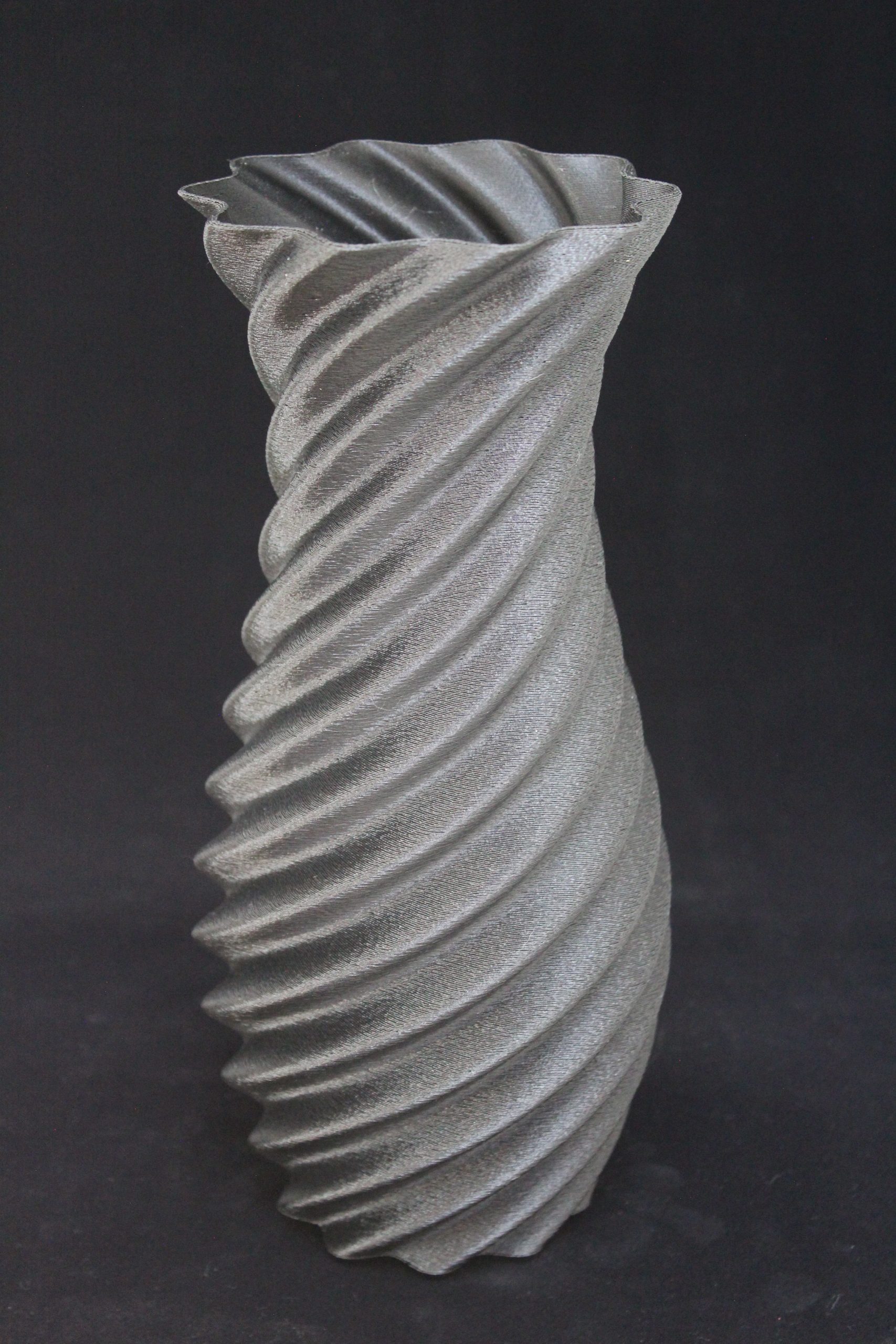 This is a 3D-printed vase with a modern, spiral design.