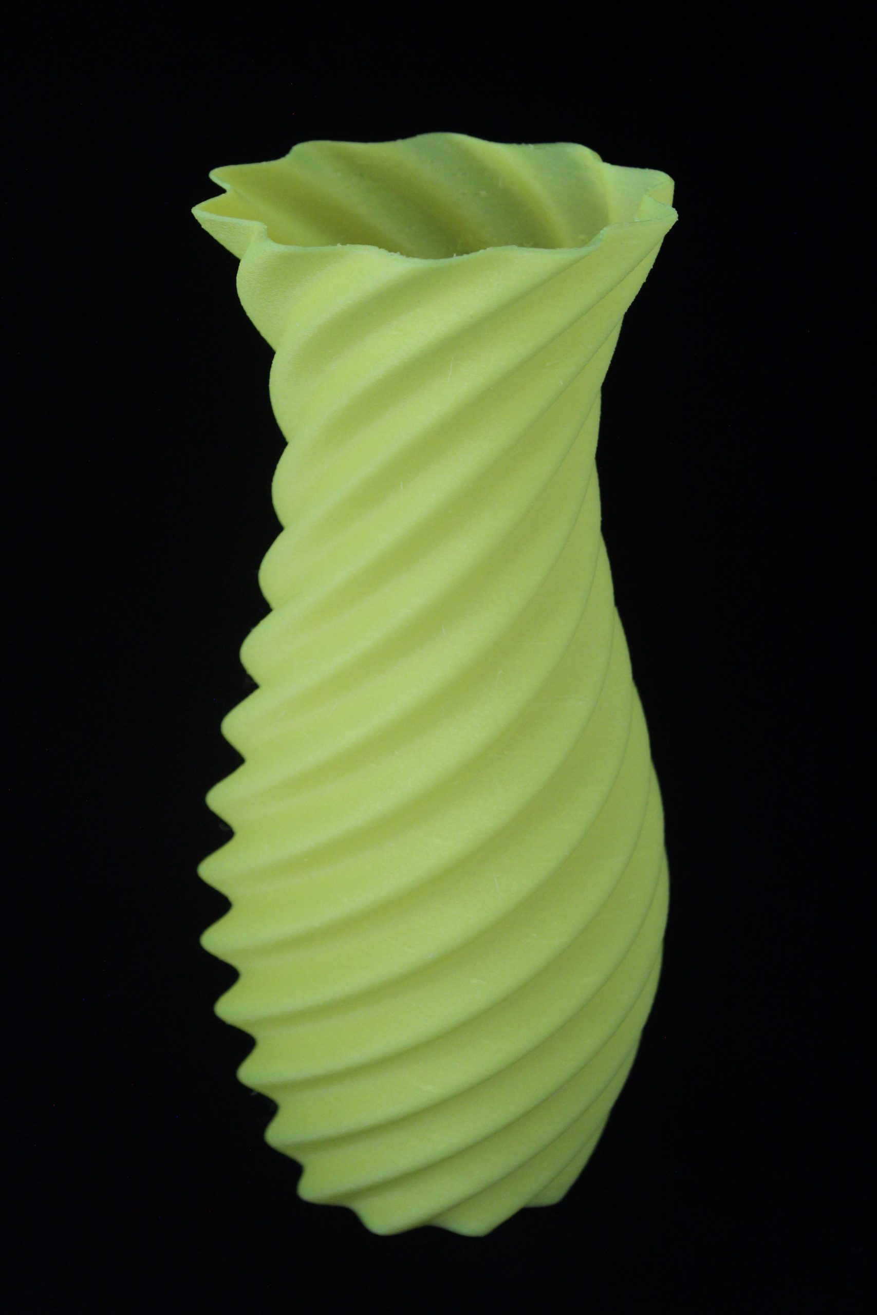 A modern 3D-printed vase with a spiral ribbed design, featuring a smooth yellow finish and an elegant, sculptural shape.